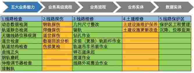 在轨道运维业务中,,,我们形成了完整的从业务能力(业务域)-业务流程-业务实体-数据模型的分析梳理过程。。。。轨道运维业务能力如下图所示:::