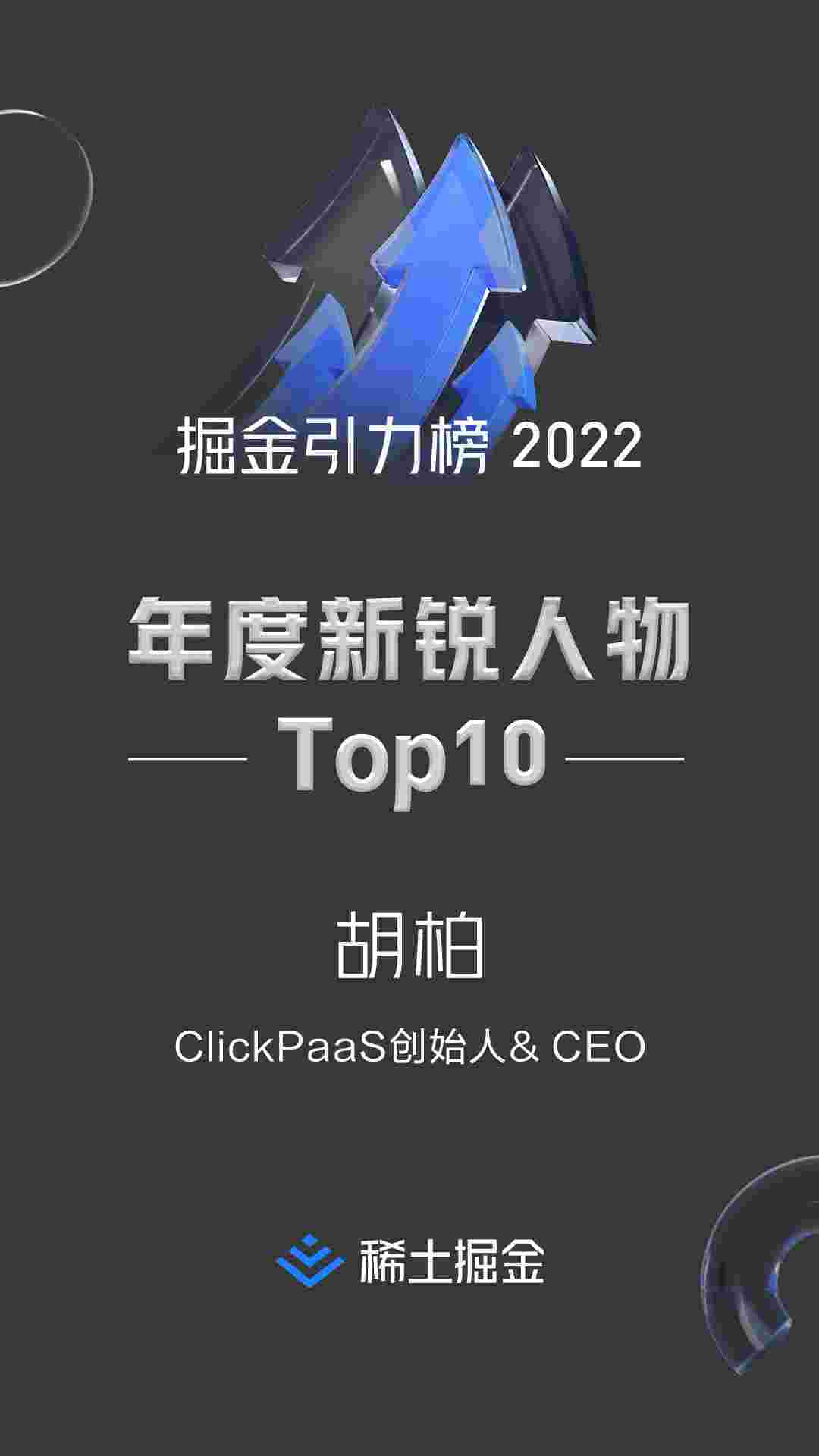 2022年1月6日,,,,稀土掘金社区第一届「掘金未来大会」成功举办,,,,会上发布了“2022 稀土掘金引力榜 年度新锐人物”榜单,,上海爱湃斯科技有限公司(简称小米钱包)创始人及CEO胡柏实力入选年度新锐人物TOP 10。。。。